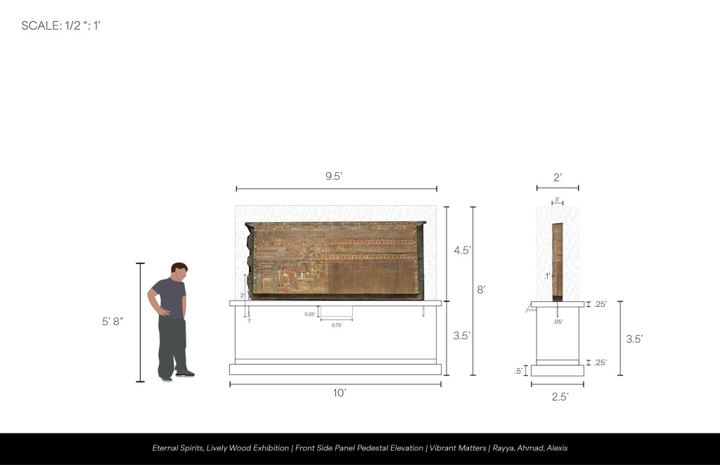 The pedestal designs, though simplistic, works to showcase the artifacts while receding into the background. Inspirations for the pedestal come from preexisting pedestals within the MFA.