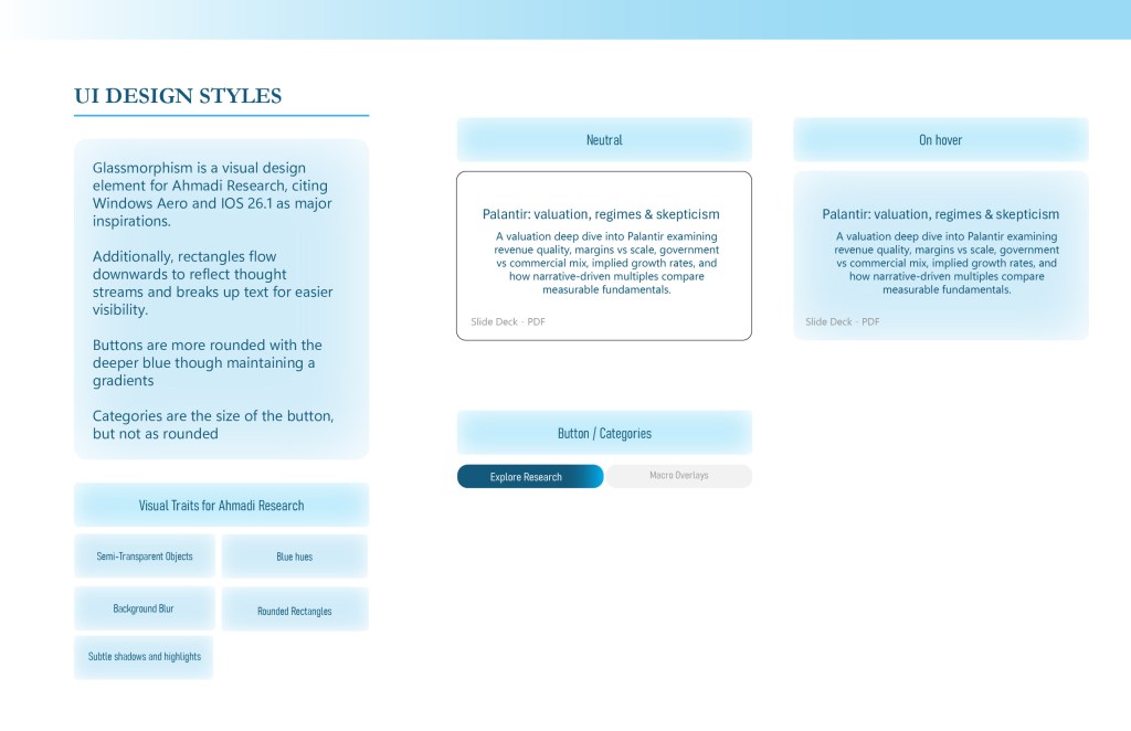 As he wanted a portfolio website, I provided him with a set of UI design styles that reflected his desire and needs of professionalism. We also explored the potential option of incorporating a glass-like effect, as he really liked the Windows Aero and IOS 26 design style.